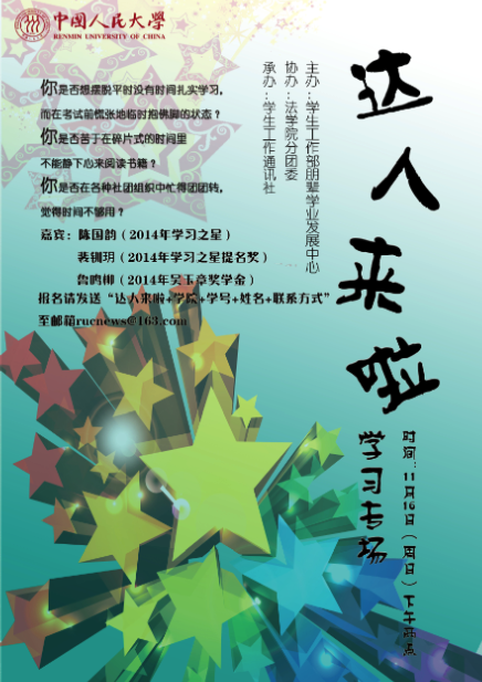 报名方式:请将姓名、学院、年级、学历、学号、联系方式于11月14日(周五)晚9:00前发送至rucnews@163.com,并在邮件标题中注明所要参加的场次,如学习专场。