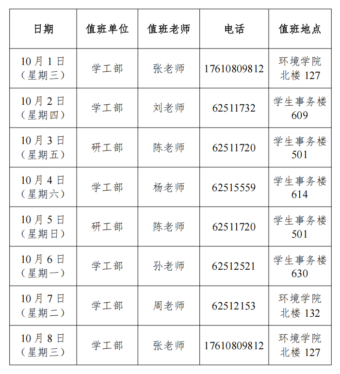 党委学生工作部(处)、党委研究生工作部、校团委2025年国庆节、中秋节值班表