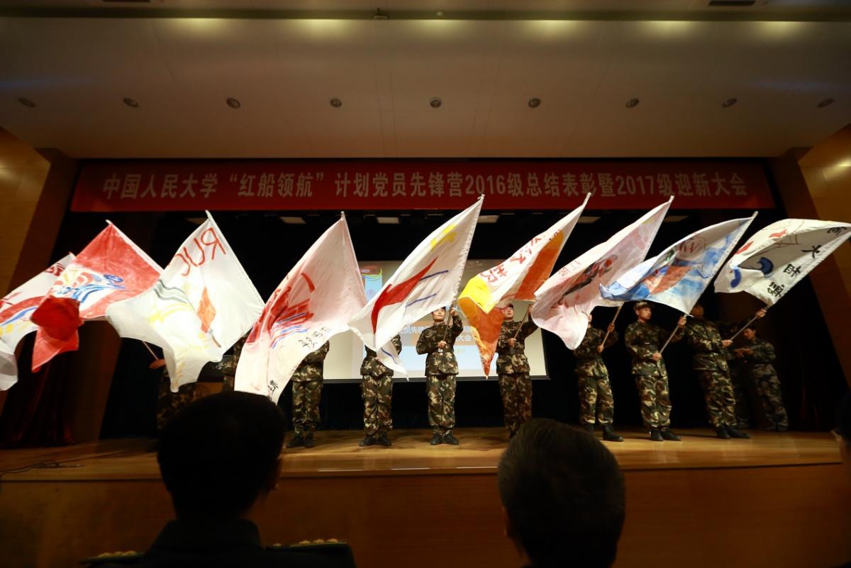 在挥舞的旗帜和热烈的掌声中,2017级“红船领航”党员先锋营正式扬帆起航,中国人民大学“红船领航”计划党员先锋营2016级总结表彰暨2017级迎新大会圆满结束。