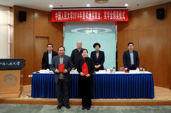 2014年12月30日下午,中国人民大学2014年费孝通奖教金、奖学金颁奖仪式在逸夫会议中心第二会议室举行。教育部原副部长、北京中国高校校友海外联谊会会长张保庆,中国人民大学党委书记靳诺,党委副书记吴付来,校长助理、学校办公室主任郑水泉出席仪式并为获奖代表颁奖。荣获2014年费孝通奖教金、奖学金的教师、学生代表参加活动。仪式由校党委副书记吴付来主持。