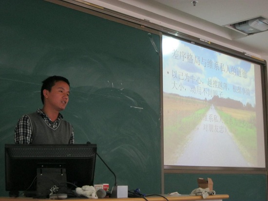 首先,三位同学分享了阅读《乡土中国》、《中国历代政治得失》和《史记》这三本经典著作的心得体会。其中,陈跃跃以“乡土中国的变迁”为题,结合自己的乡村生活经验对《乡土中国》一书进行了细致解析,并对书中的几个抽象概念,如“差序格局”、“血缘”、“地缘”等进行了生动诠释,也把该书与学校正在进行的“千人百村”社会调研活动相结合,强调了进行乡土实践的重要性。