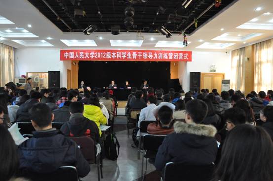 12月5日,中国人民大学2012级本科学生骨干领导力训练营结营式在学生活动中心东厅隆重举行。学生工作部部长张晓京、副部长文书锋、训练营指导教师、全体辅导员和181名学员人参加了结业仪式。活动由学生工作部任宪伟老师主持。