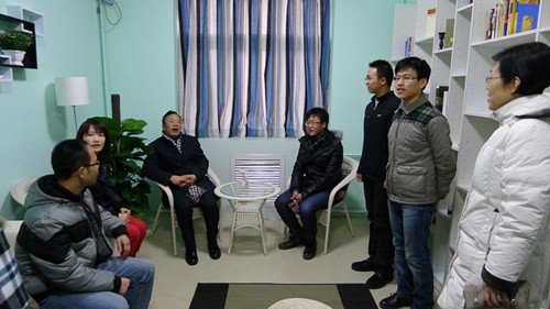 最后,马俊杰副书记一行来到刚刚建成的东风七楼“拾光小屋”,向公寓辅导员、自管会同学、获得“十佳宿舍”荣誉的同学以及全体东风七楼同学送上新年祝福和礼物。他听取了辅导员们关于“拾光小屋”建设和公寓成长辅导空间拓展情况的介绍,感谢公寓辅导员和自管会同学们的辛勤付出,对大家能够自主建设这样一间温馨舒适并且具有文化品位的房间表示赞赏。他还表示愿意向“拾光小屋”捐赠自己的藏书和著作,与同学们共同分享读书学习的快乐。