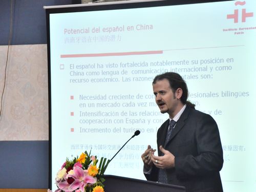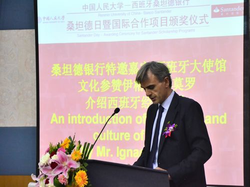 仪式最后,桑坦德银行特邀嘉宾西班牙大使馆文化参赞伊格纳修·莫罗先生向大家介绍了西班牙的经济文化,他也希望更多的同学通过桑坦德国际合作项目获得去西班牙学习交流的机会,进一步促进中西文化交流。