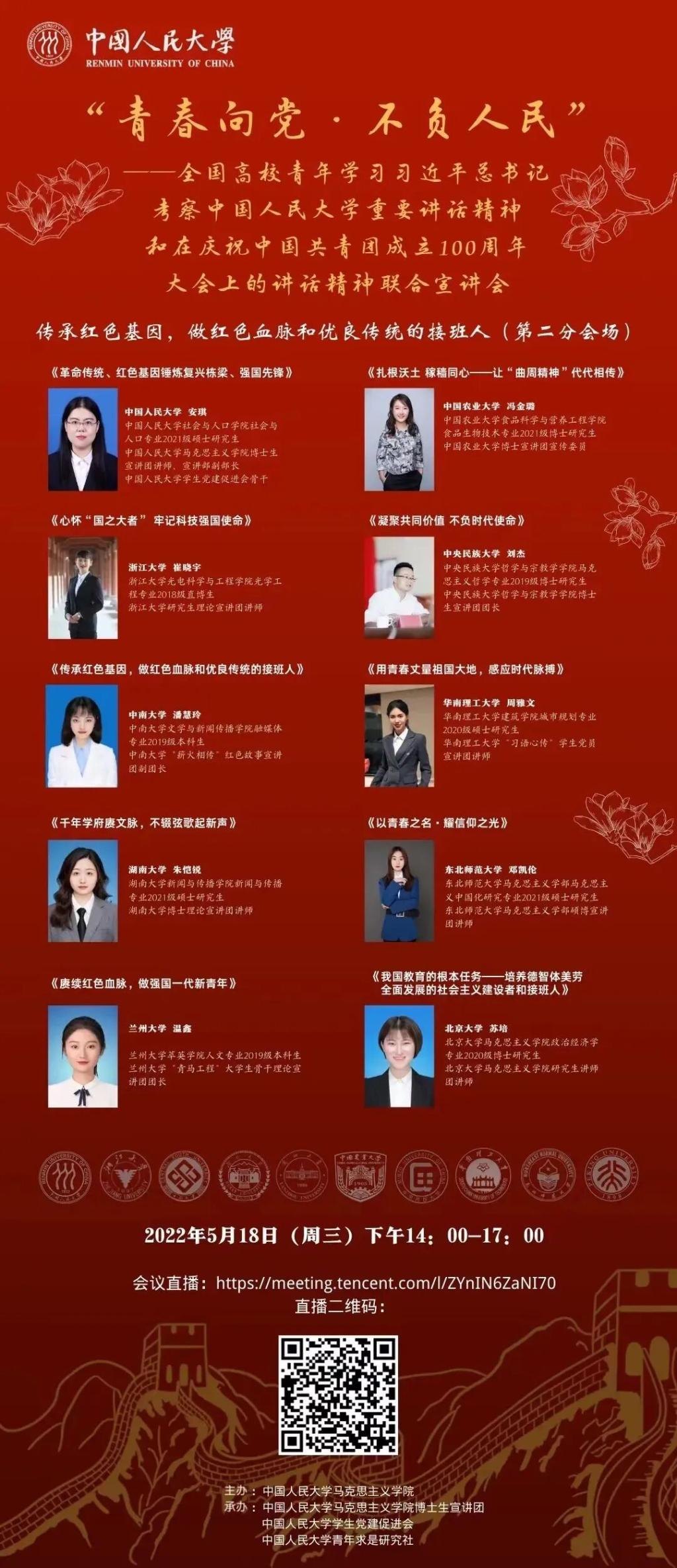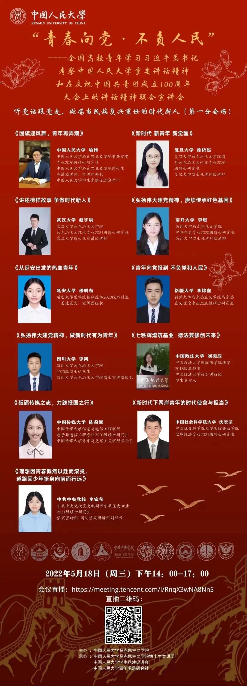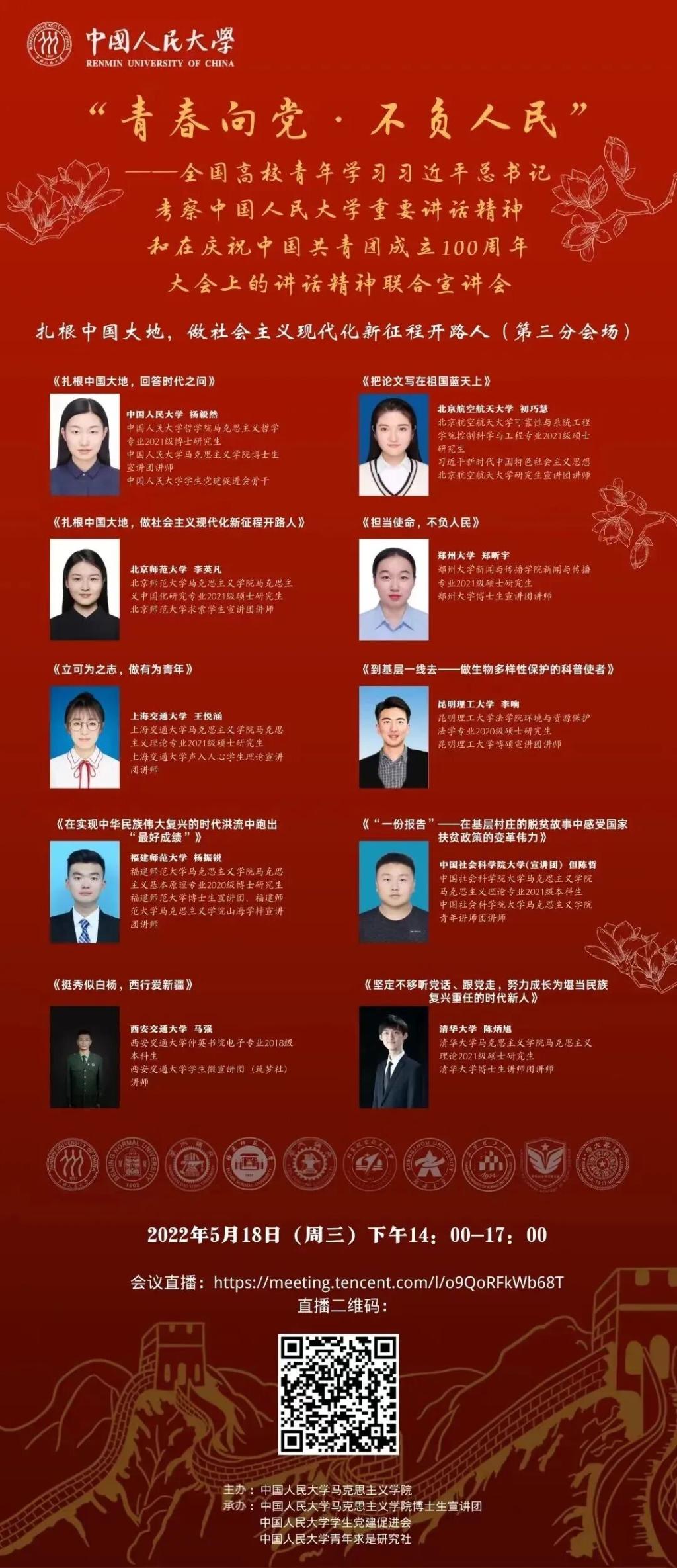青年是国家的未来,是民族的希望。新时代的中国青年处在中华民族发展的最好时期,既面临着难得的建功立业的人生际遇,也承载着“天将降大任于斯人”的伟大使命。新时代中国青年要始终牢记习近平总书记嘱托,以实现中华民族伟大复兴为己任,不负党的期望、人民的期待、民族的重托,不负我们这个伟大时代!中国人民大学马克思主义学院博士生宣讲团和各兄弟高校宣讲团5月18日期待与您相见,共话青春使命,共献时代青年的青春之礼!