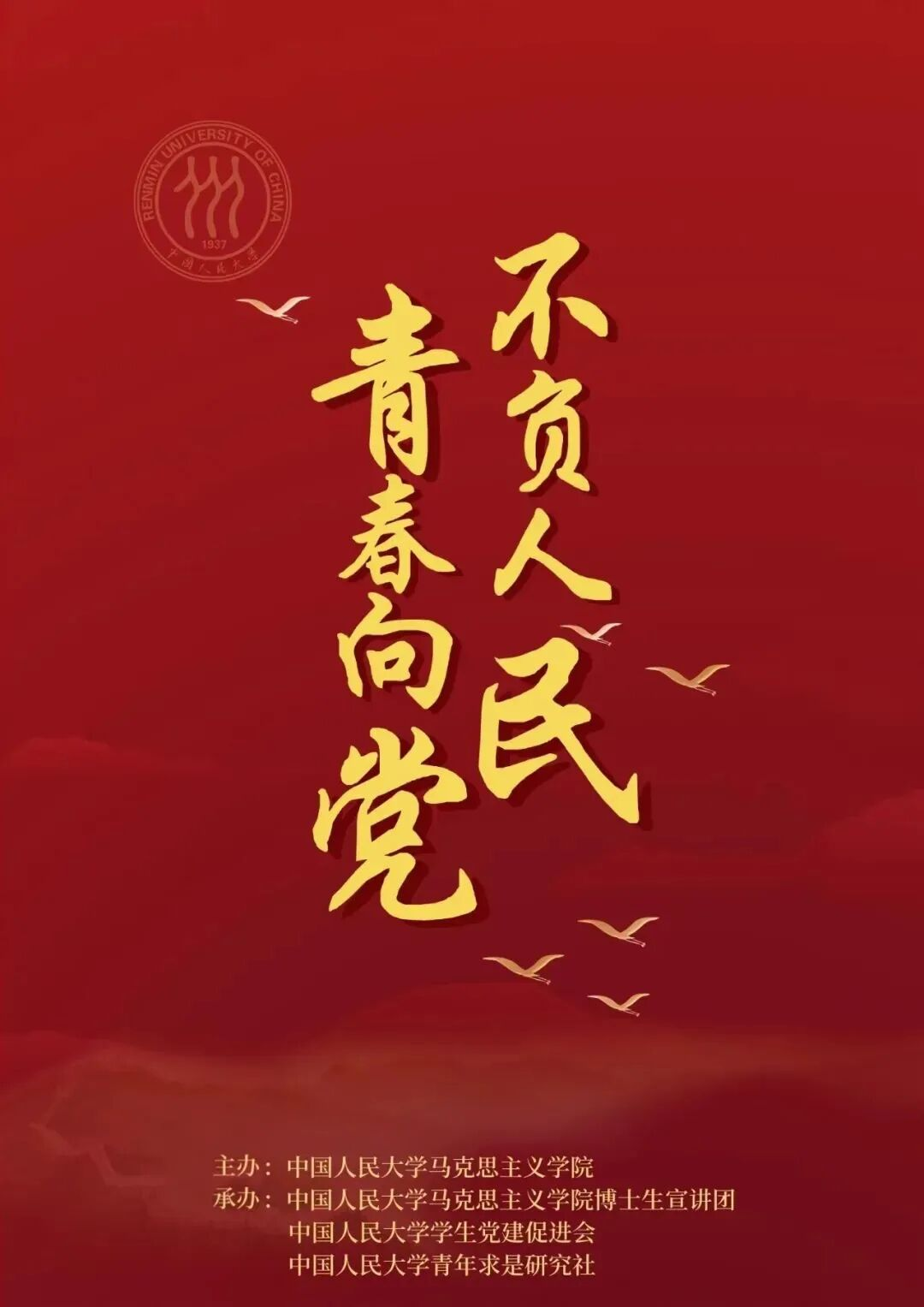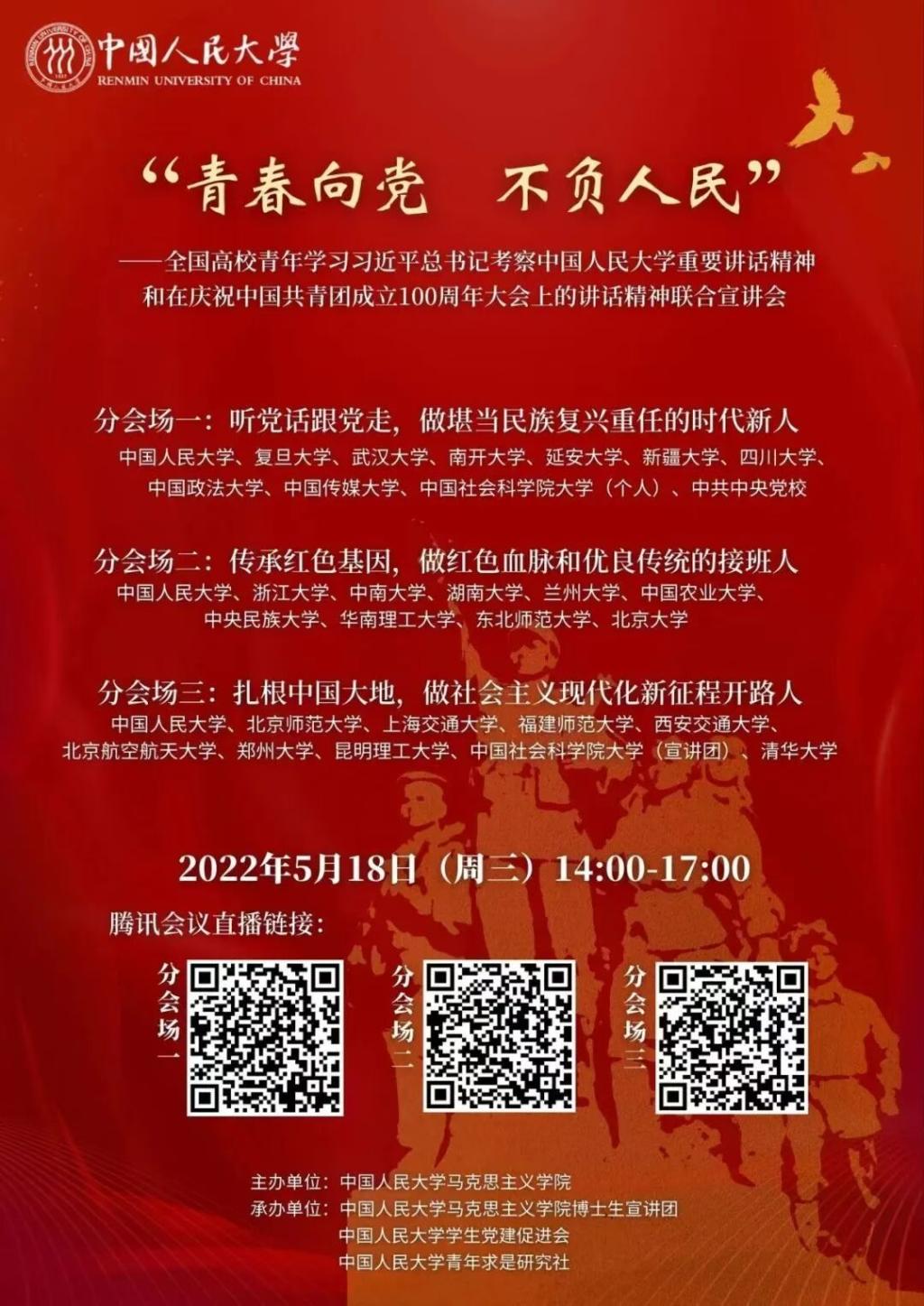 为深入学习贯彻习近平总书记考察中国人民大学重要讲话精神和在建团百年庆祝大会上的讲话精神,深刻领悟新时代中国青年的奋斗目标和前行方向,引导全国广大高校青年自觉把思想和行动统一到习近平总书记重要讲话精神上来,在青春的赛道上跑出当代青年最好成绩,中国人民大学马克思主义学院拟于5月18日联合全国高校共同举办“青春向党 不负人民”——全国高校青年学习习近平总书记考察中国人民大学重要讲话精神和在庆祝中国共青团成立100周年大会上的讲话精神联合宣讲会。